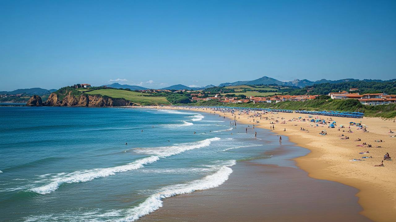 La Grande Plage constituye el epicentro de la vida playera en San Juan de Luz, una extensa franja de arena dorada que se extiende en forma de media luna frente al casco histórico del pueblo. Esta playa destaca por su configuración natural privilegiada, protegida por los diques que la resguardan del oleaje del Atlántico, creando aguas tranquilas ideales para el baño familiar. El paseo marítimo conocido como Promenade de Bord de Mer bordea esta costa, ofreciendo vistas panorámicas hacia Ciboure y la silueta del monte Jaizquibel en el horizonte. La amplitud de esta playa permite que incluso en temporada alta se puedan encontrar espacios para disfrutar con relativa tranquilidad, y su orientación hacia la bahía la convierte en un escenario perfecto para contemplar las puestas de sol sobre el océano. Los servicios cercanos, que incluyen desde establecimientos del Grand Hôtel Thalasso hasta el Casino La Pérgola, se integran de manera armoniosa con el entorno natural, manteniendo un equilibrio entre turismo y preservación.